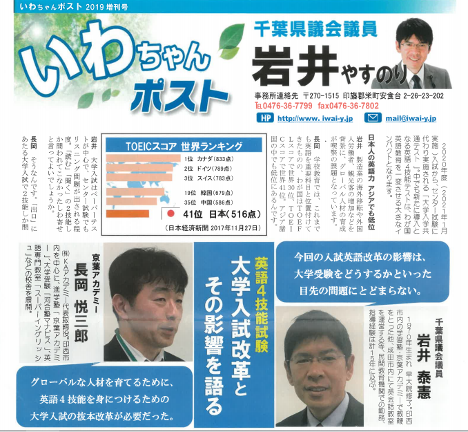 地元の千葉県議会議員岩井やすのり氏が発行するポストに、英語教育に関する対談記事が掲載されました。この度は対談の機会を頂き、有難うございました。
